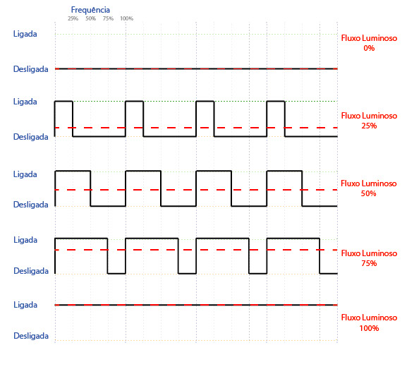 Na imagem abaixo demonstramos como é este sistema de Liga/Desliga, observe que quanto mais tempo a placa de LED fica ligada, maior será o fluxo luminoso.